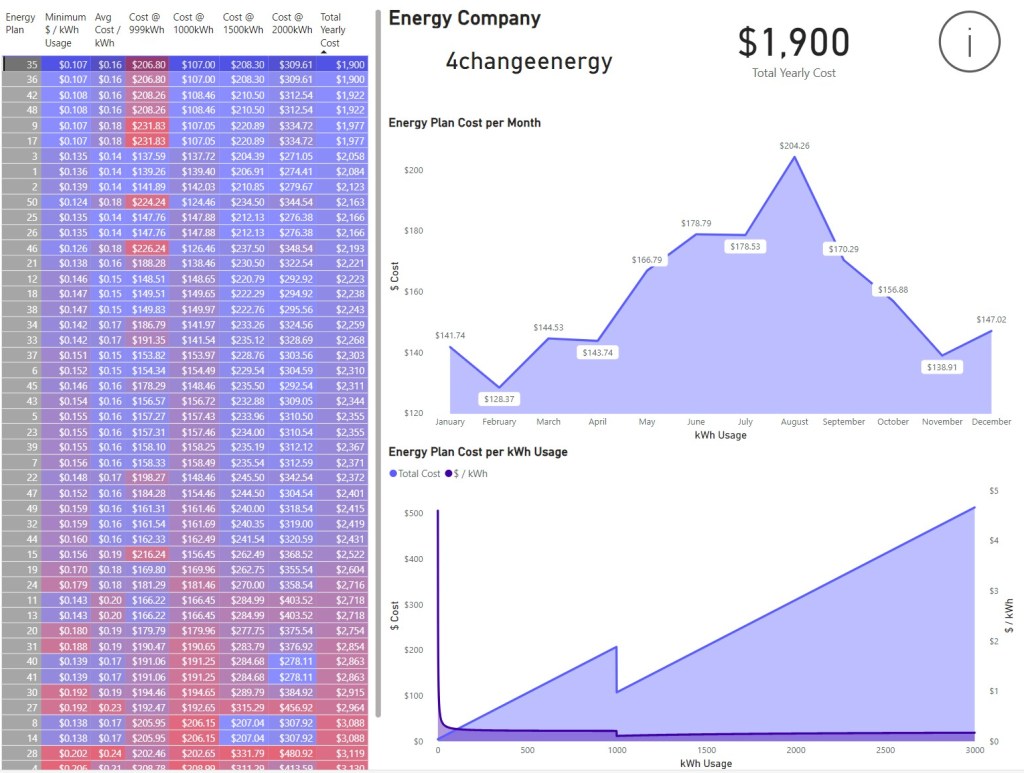 - Visualization & Decision-Making: I used Power BI to build an interactive dashboard, which allowed me to visualize how much I would pay under each plan based on my predicted energy usage. This made comparing the 60 different energy plans manageable and easy to digest.